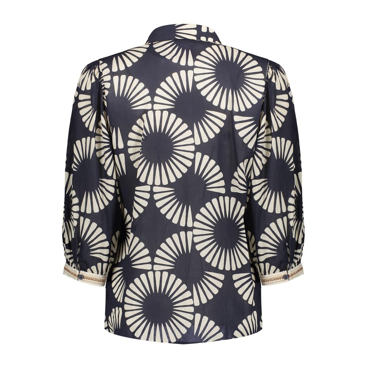 Deze damesblouse van Geisha is gemaakt van zacht vallende stof met een grafisch all-over dessin in ecru op zwart. De blouse heeft een klassieke kraag, een doorlopende knoopsluiting en 3/4-mouwen met subtiele plooien en elastische manchetten met een verfijnde bies. Zonder borstzakken en zonder zichtbaar logo voor een clean effect. De soepele kwaliteit draagt comfortabel en beweegt mooi met je mee. Dit kledingstuk is te koop via de webshop of in de winkel bij Steegenga Mode in Friesland.