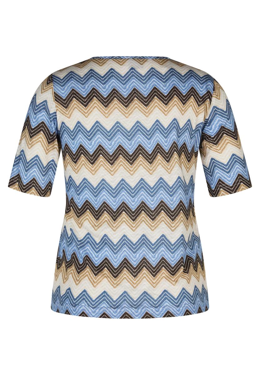 Dit T-Shirt van Rabe heeft een ronde hals, halve mouw tot de elleboog en een rechte pasvorm zonder sluiting. Het meerkleurige zigzag dessin in blauw, zand, crème & bruin geeft het kledingstuk direct karakter. De soepele, huidvriendelijke kwaliteit draagt comfortabel en valt netjes op de heup. Nette zomen zorgen voor een verzorgde uitstraling. Categorie: Dames, T-Shirts & Tops. Geslacht: Dames.