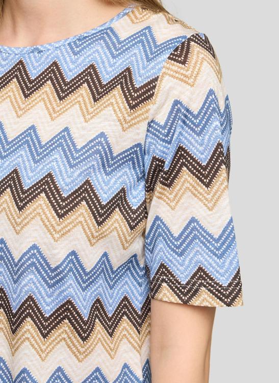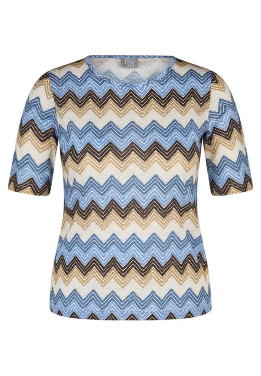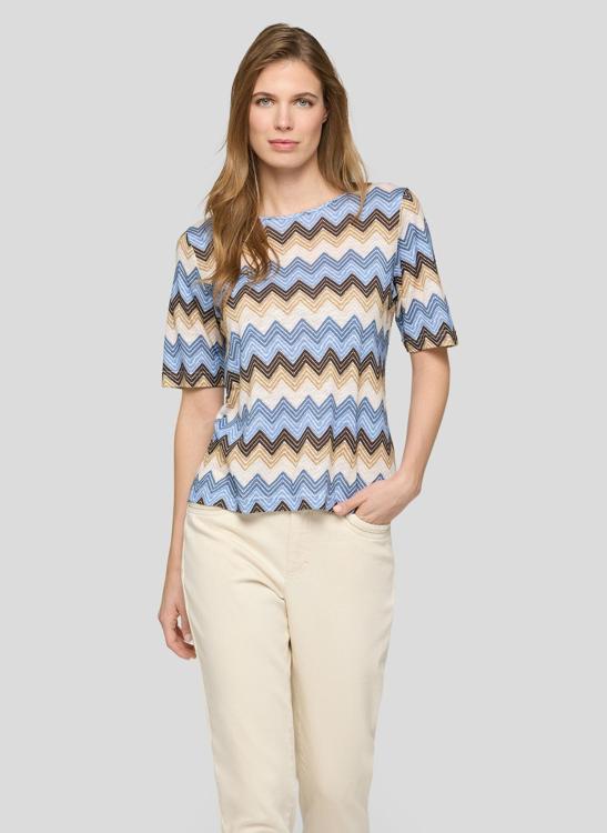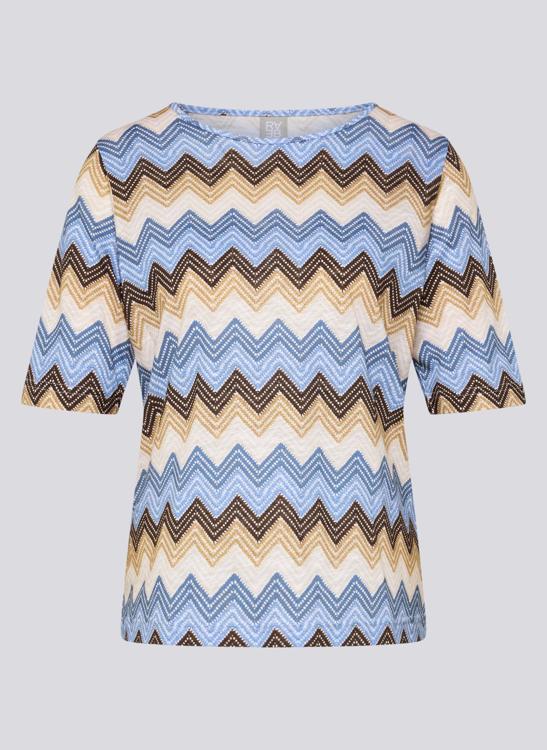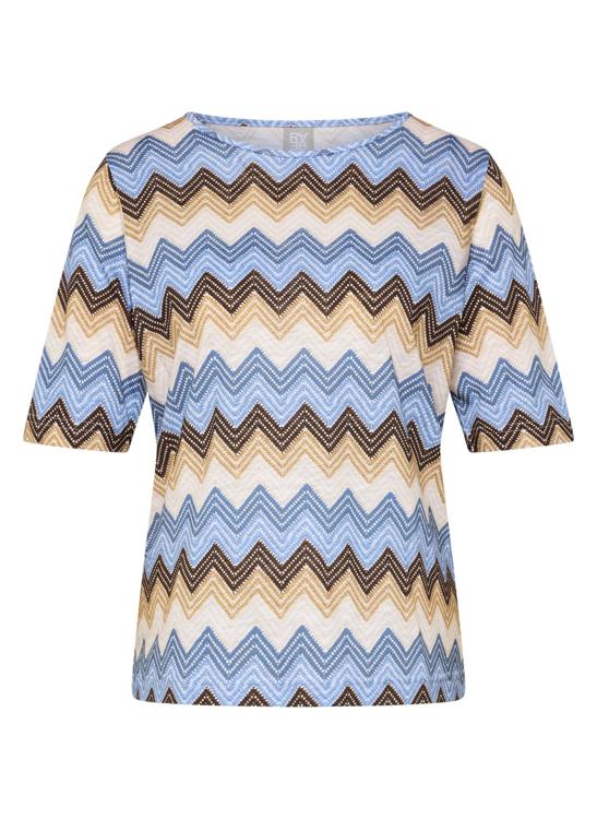 Het grafische zigzag dessin sluit aan bij de trend van zachte aardetinten en koele blauwtinten. Combineer met een ecru pantalon, een blauwe jeans of een zandkleurig vest of blazer voor een verzorgd geheel. Je draagt dit T-Shirt moeiteloos naar een lunch, museumbezoek of casual werkdag. Voor dames die houden van tijdloze verfijning.