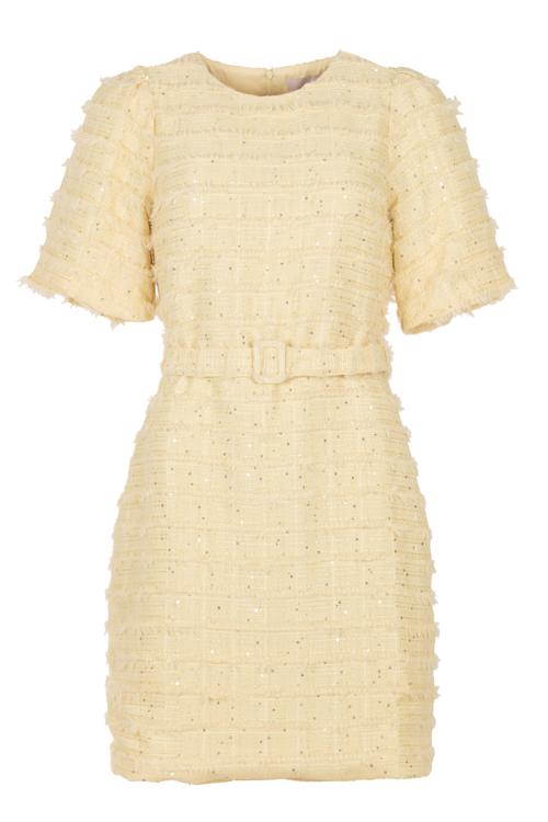 De jurk is vervaardigd in een geweven hairy-structuur met subtiele pailletten die luxueus glanzen. De ronde hals en korte mouwen geven een tijdloze basis. De taille wordt geaccentueerd door een afneembare ceintuur in dezelfde stof; de ceintuur sluit met een beklede gesp. Het silhouet is recht met een mini-lengte en nette