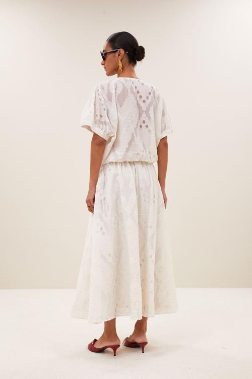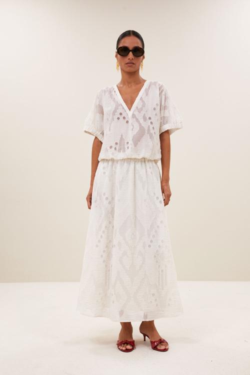 Deze dames blouse heeft een luchtige, geweven kwaliteit met subtiel, semi-transparant dessin. De V-hals en de korte mouwen met zachte elastische zoom geven een ontspannen pasvorm. De elastische onderzoom zorgt voor een blousend effect. Je trekt de blouse eenvoudig aan dankzij het ontwerp zonder sluiting. Tijdloos en verfijnd zoals je van By-Bar verwacht; perfect in de categorie Dames, Blousen & Tunieken.
