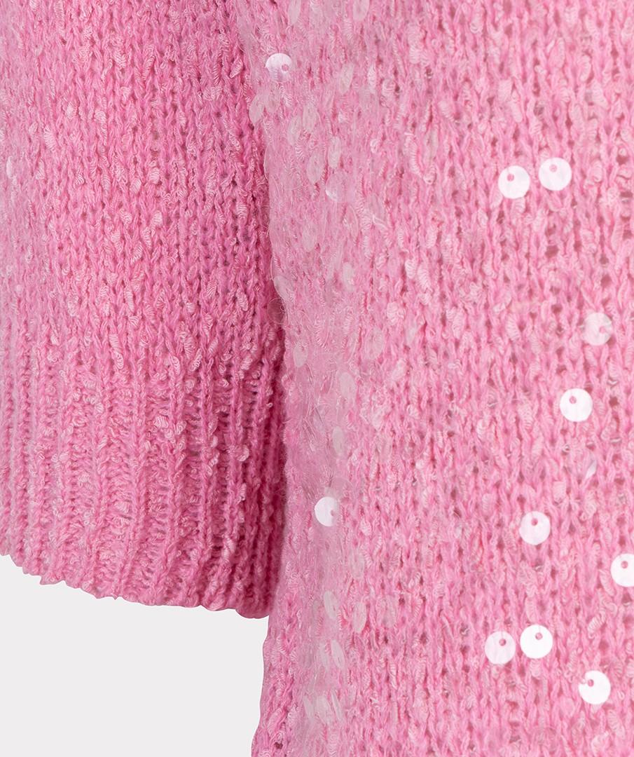 Deze roze, gebreide trui is uitgevoerd in een zachte kwaliteit met ronde hals. Het instapmodel zonder sluiting heeft halflange mouwen en ribboorden aan mouw en zoom voor mooie vormvastheid. De voorzijde is afgewerkt met glanzende pailletten die het licht subtiel vangen. Geen zakken en een clean silhouet zorgen voor een tijdloze look. Een feestelijke trui voor Dames van Esqualo.
