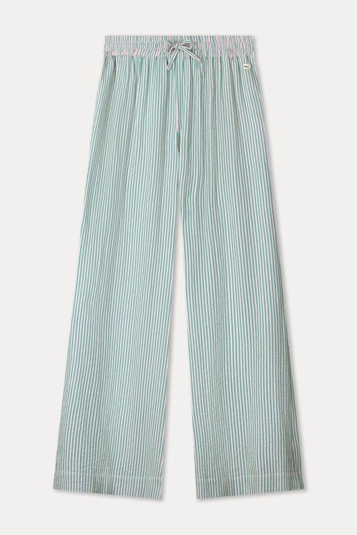 Het ontwerp sluit aan bij de wide-leg trend en de frisse streep. De zachte minttint oogt modern in het voorjaar en de zomer. Combineer met een effen blouse, linnen overhemd of fijngebreide trui; kies voor sandalen, espadrilles of witte sneakers. Met blazer geschikt voor kantoor, met T-shirt casual. Maak de set compleet met een top van POM Amsterdam. Dames kiezen hiermee voor tijdloze elegantie.