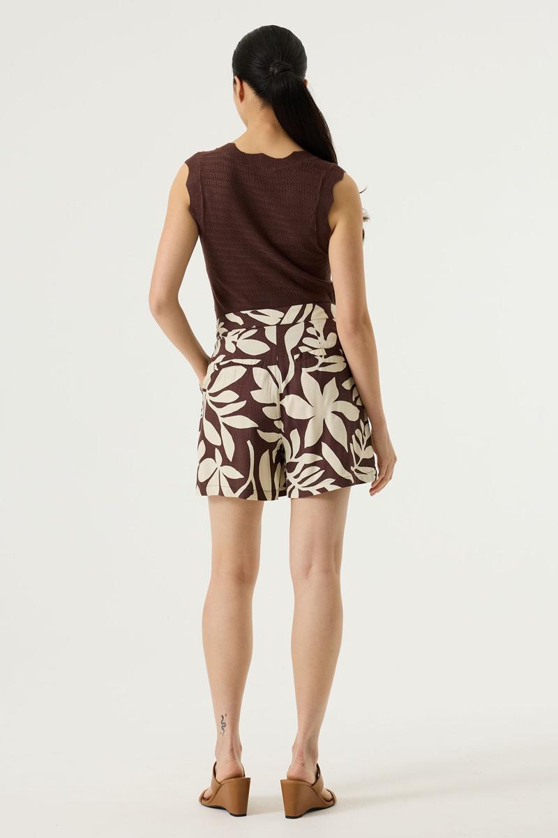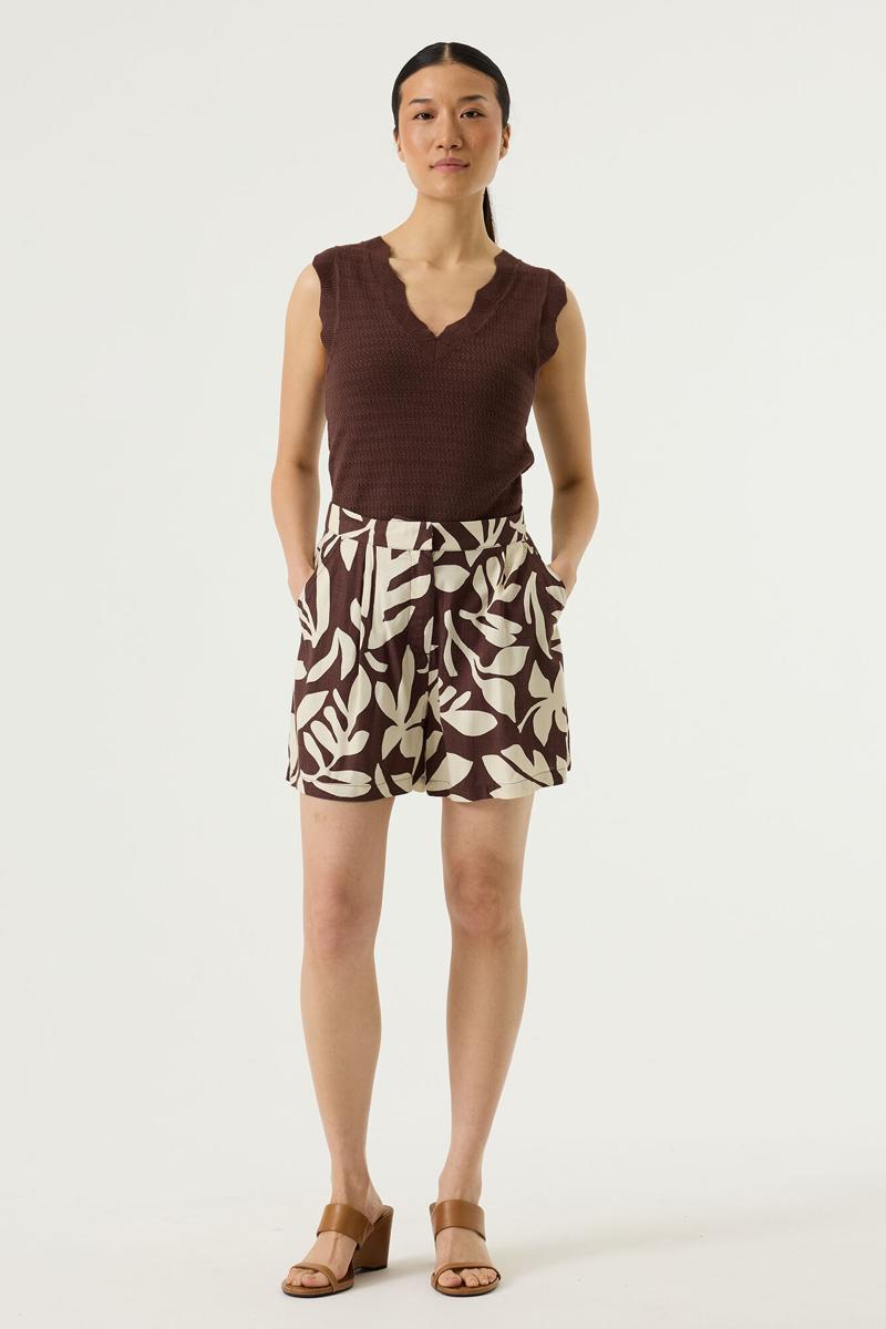 De short is uitgevoerd in een soepele, luchtige kwaliteit en valt comfortabel dankzij de gevormde tailleband. De contrasterende botanische bladprint in ecru op donkerbruin geeft een moderne look. Voorzijde met subtiele plooien, een nette gulp met verborgen sluiting en praktische steekzakken; achterzijde glad voor een clean silhouet. De rechte, iets wijde pijpen zorgen voor bewegingsvrijheid. Als dames broek van Garcia combineer je functionaliteit met stijl in één kledingstuk.