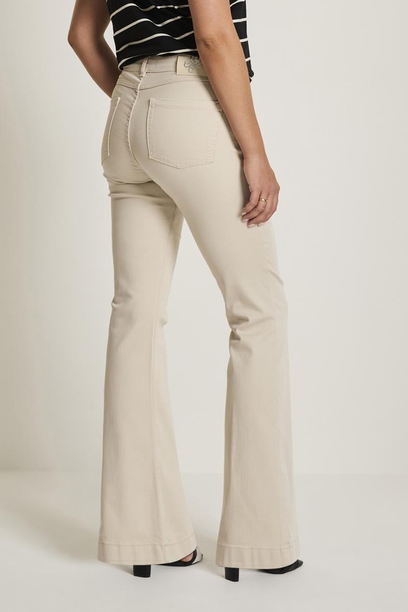 De flared vorm en de zandkleur sluiten aan bij de 70’s-revival en de neutral-tones trend. Als dames denim combineer je deze broek met een blazer, gebreide trui of blouse; draag sneakers voor werk of hakken voor diner. De effen tint maakt de jeans inzetbaar in elk seizoen en matcht moeiteloos met zwart, wit en pastels.