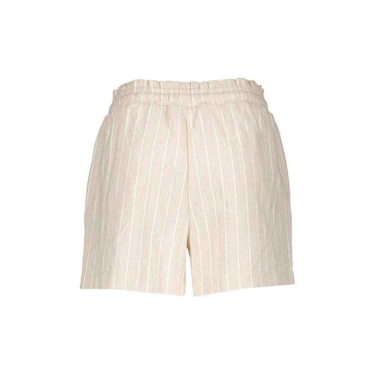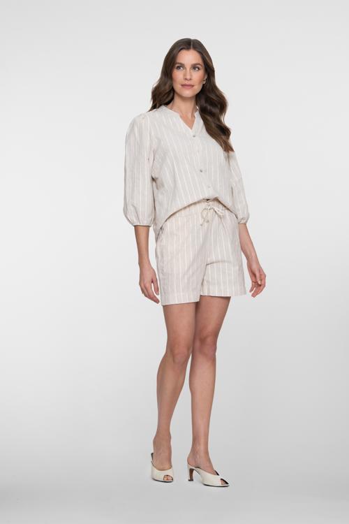 De Geisha Shorts 61185-70 is een dames kledingstuk in een luchtige, geweven kwaliteit met linnenlook. Het verticale krijtstreep dessin op een zandkleurige basis oogt fris en tijdloos. De elastische, licht geplooide taille met strikkoord geeft een verstelbare pasvorm; een rits is niet nodig. De short heeft twee handige steekzakken en rechte pijpen op bovenbeenlengte voor een elegante lijn. Subtiele stiksels houden het ontwerp rustig en chic-een veelzijdige short van Geisha die je lang met plezier draagt.