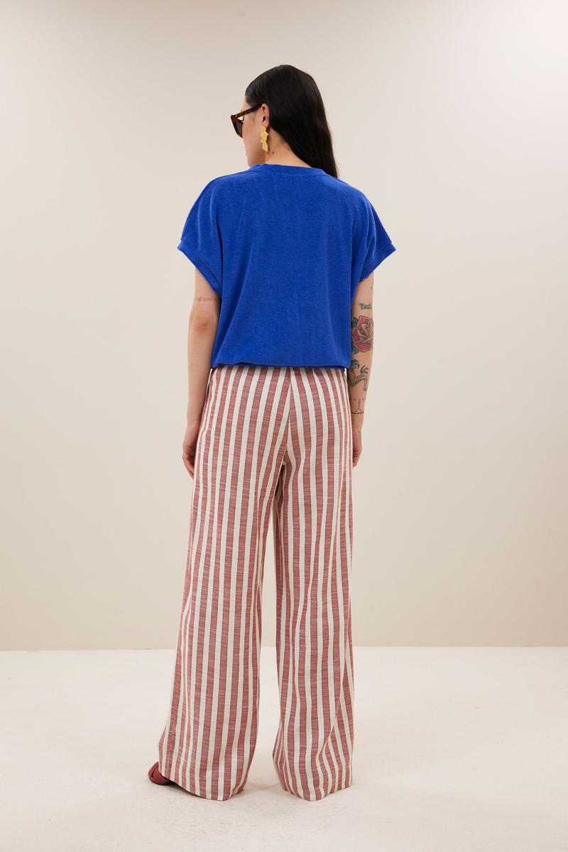 De heldere blauwe tint past naadloos in de color-pop & resorttrend. Je combineert de Dames top met een linnen broek, een high-waist jeans of onder een blazer voor een nette look. Draag het kledingstuk naar kantoor, in het weekend of op vakantie; de relaxte snit en egale kleur maken stylen eenvoudig én tijdloos.