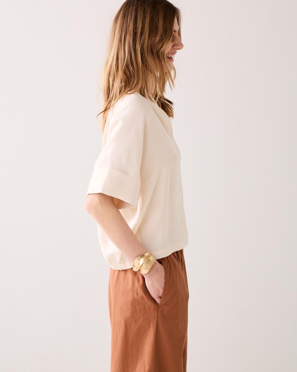 Deze top van Summum is uitgevoerd in een zachte, luchtige geweven kwaliteit. Het model heeft een V-hals zonder kraag, geen sluiting, korte wijde mouwen met omgeslagen boord en een rechte zoom. De centrale naad middenvoor zorgt voor een verfijnde belijning. Het effen ecru dessin maakt dit kledingstuk tijdloos & veelzijdig binnen Dames, T-Shirts & Tops.