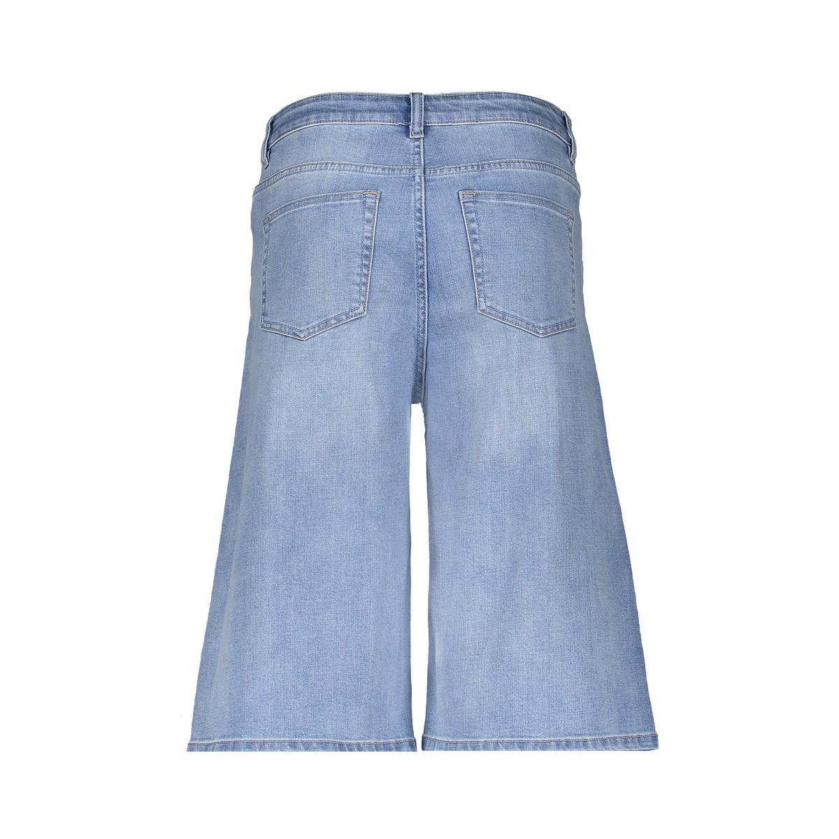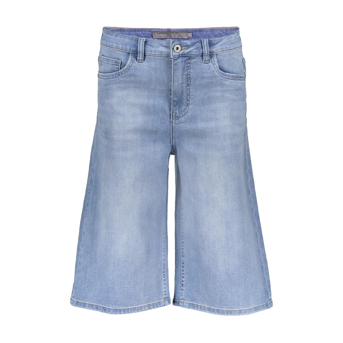 Deze lichtblauwe denim bermuda heeft een middenhoge taille, wijde pijpen en een knielengte die luchtig valt. Voorzijde met knoop- & ritsluiting, voorzakken en opgestikte achterzakken. De egale wassing oogt fris en tijdloos. Het kledingstuk is ontworpen door Geisha en valt elegant wijd voor extra bewegingsvrijheid.