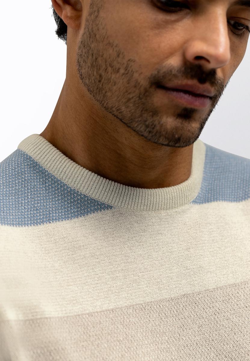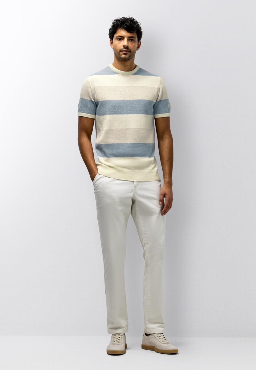 Dit T-Shirt van State of Art heeft een comfortabele, ademende kwaliteit, een ronde hals zonder sluiting en korte mouwen. De brede horizontale strepen in lichtblauw, beige en ecru geven het kledingstuk karakter. Ribboorden bij hals, mouwen en zoom zorgen voor vormvastheid. Op de linkermouw staat een subtiele merkbadge. Ontworpen voor Heren binnen de categorie Heren, T-Shirts & Polo's, en gemaakt voor dagelijks draaggemak.