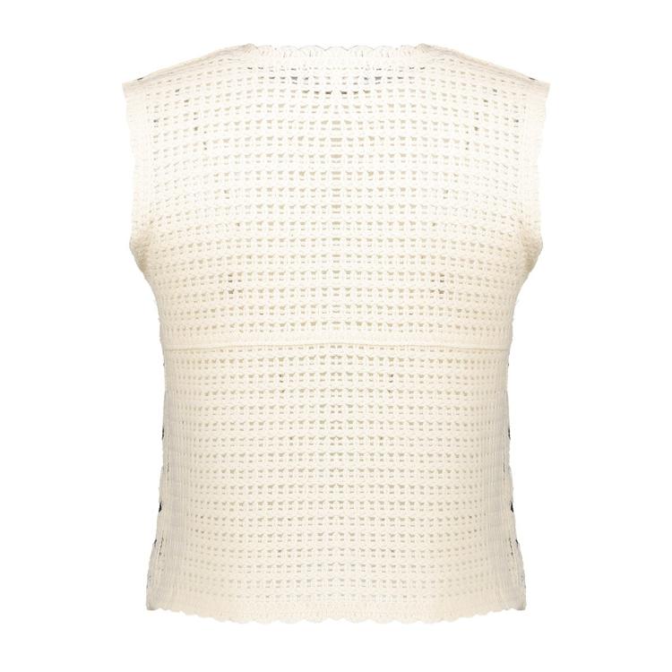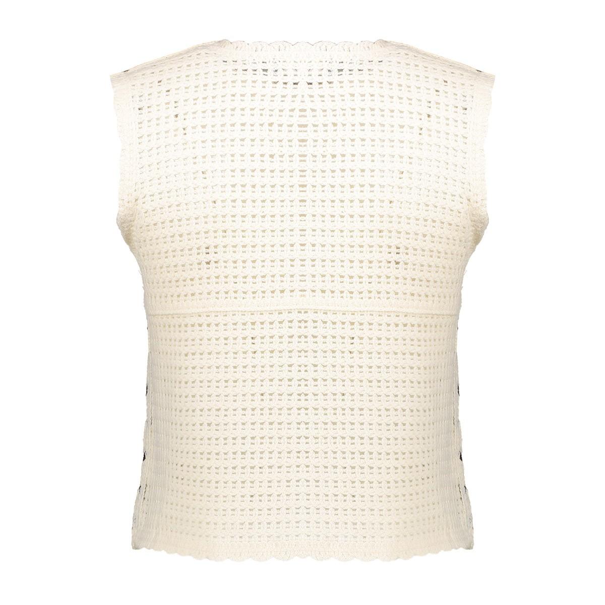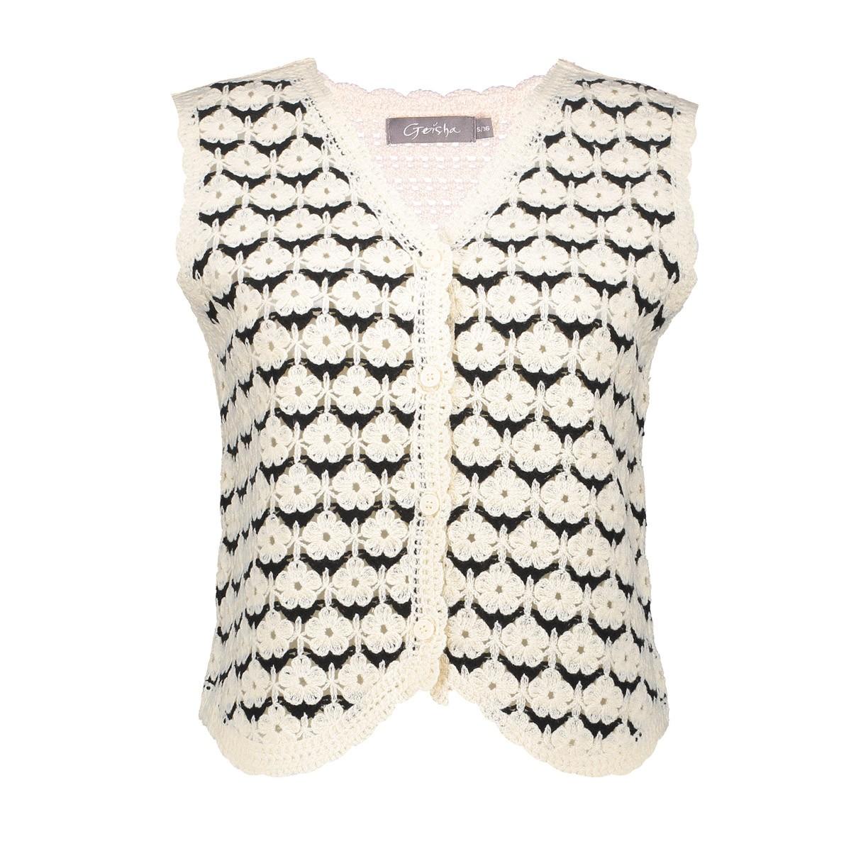 Deze Geisha trui voor dames valt op door het gehaakte opengewerkte breisel met bloemmotief in ecru met donker contrast. Het mouwloze ontwerp heeft een ronde hals, een open voorzijde zonder zichtbare sluiting en sierlijke, gehaakte boorden. De achterzijde is fijn gehaakt en luchtig. Binnenin de hals staat het Geisha logo. Een stijlvol kledingstuk binnen de categorie Truien & Vesten, ontworpen voor dames die graag laagjes dragen en comfort en detail waarderen.