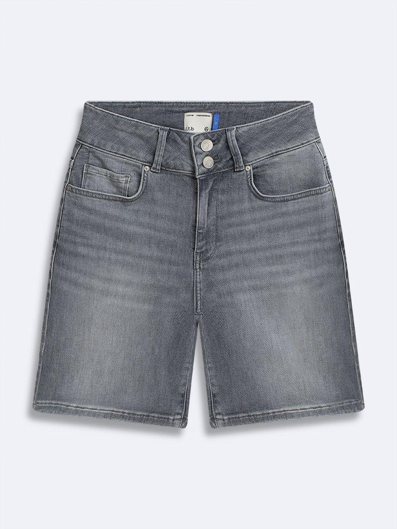 Deze jeansshort van LTB Jeans is uitgevoerd in grijze denim met subtiele vervaging. Het ontwerp heeft een dubbele knoopsluiting met rits, vijf zakken inclusief muntzakje, riemlussen en een rechte pijp tot net boven de knie. Achterop staat een label met het LTB-logo en twee opgestikte achterzakken met sierstiksel. De nette zoom zonder rafels geeft het kledingstuk een verzorgde uitstraling.