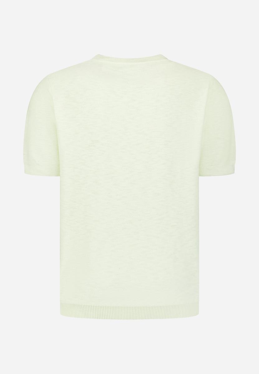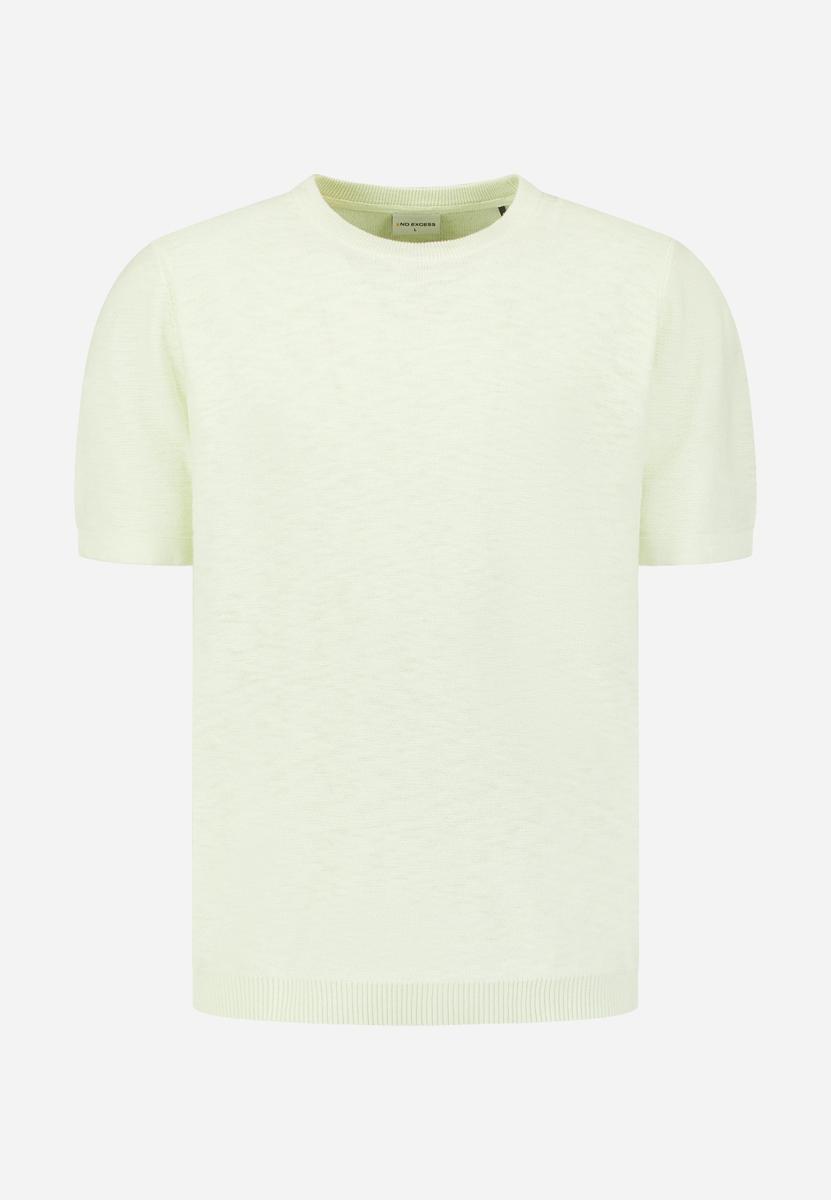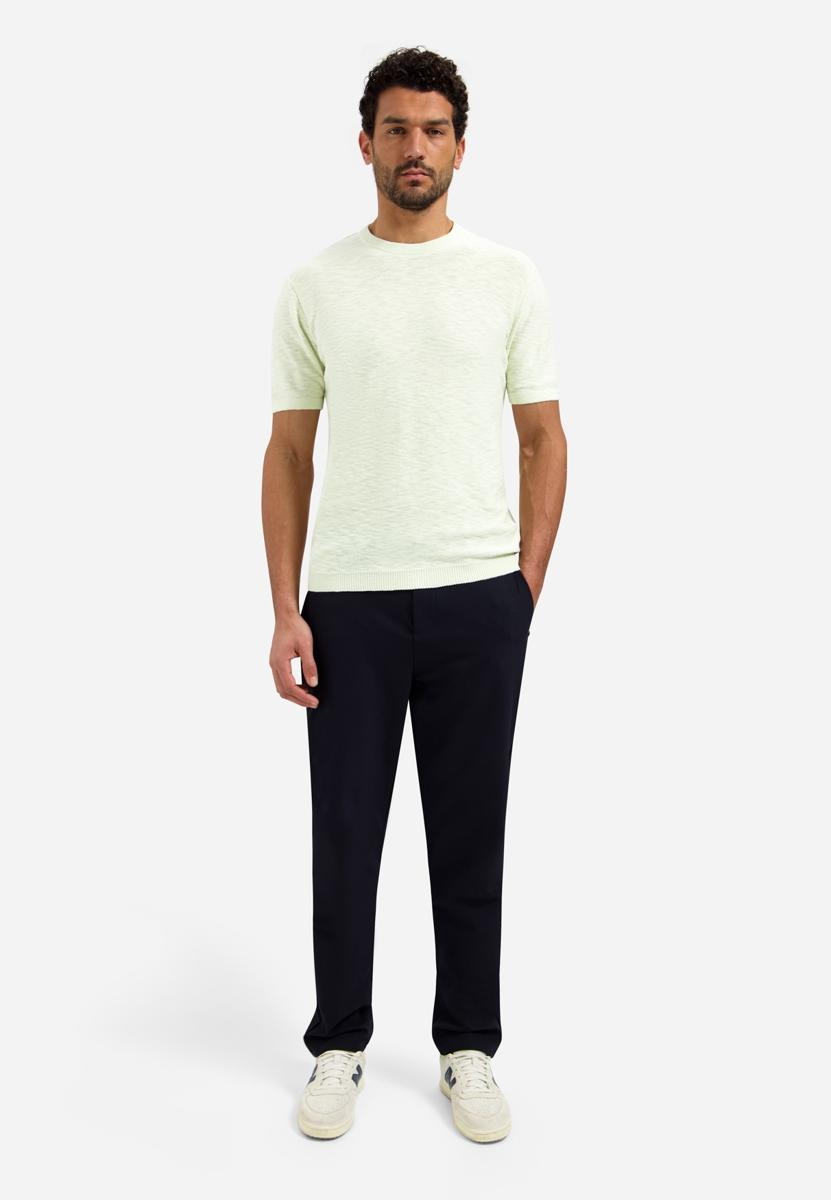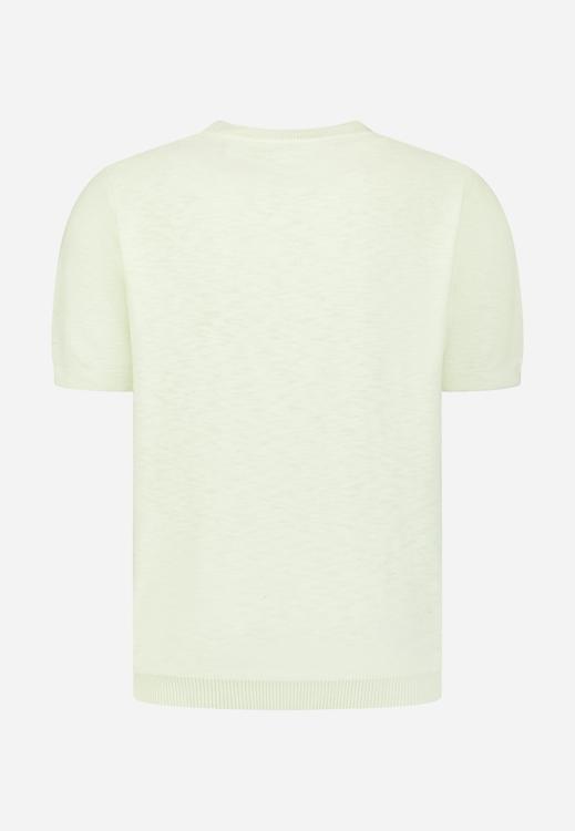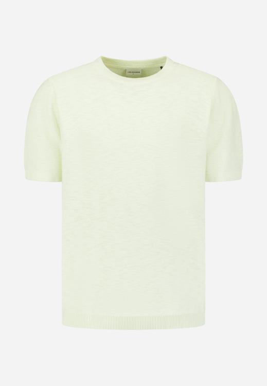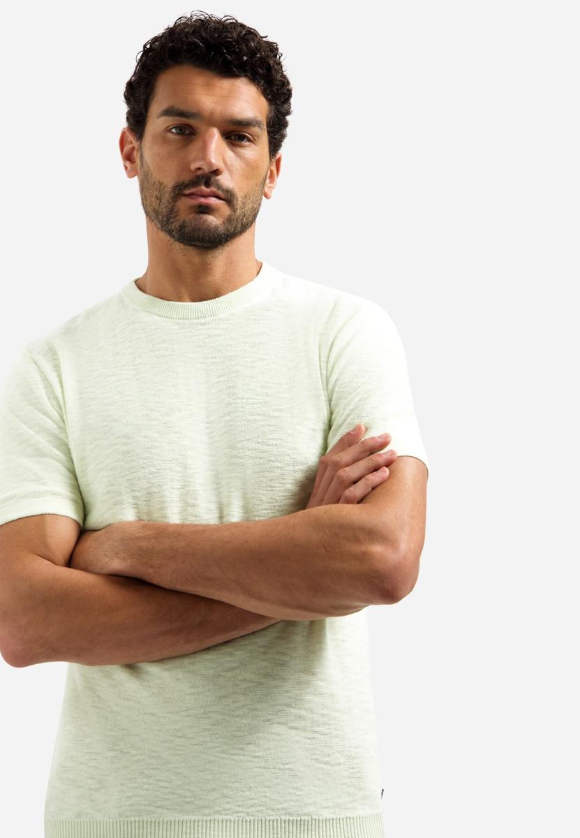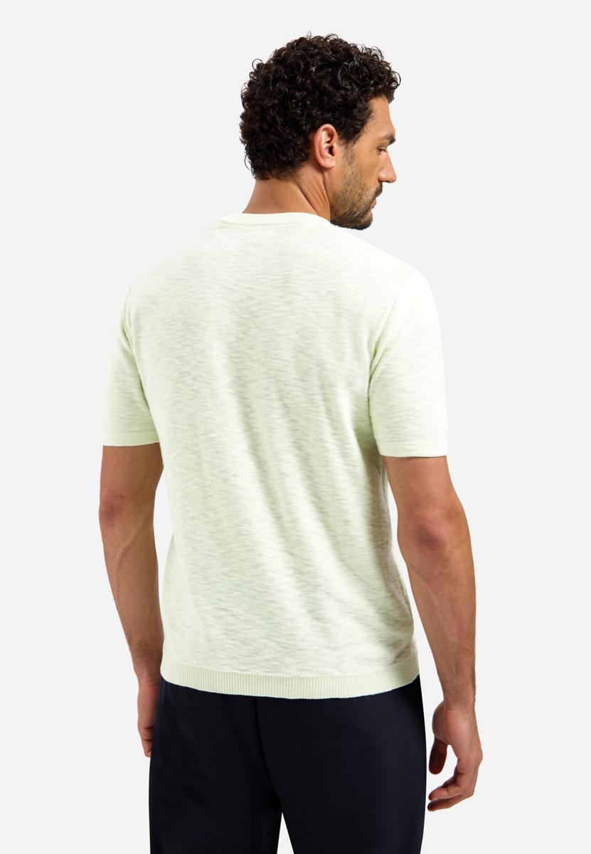 De kleur is zacht lichtgroen met een minimalistische uitstraling en een subtiel structuurdessin. Combineer met een navy chino of donkere jeans en witte sneakers; voor een nette look draag je er een licht jasje of overshirt over. Geschikt voor werk & weekend, vooral op lichtere dagen. Als heren T-shirt vormt het een rustige basis. Populaire maten gaan snel.