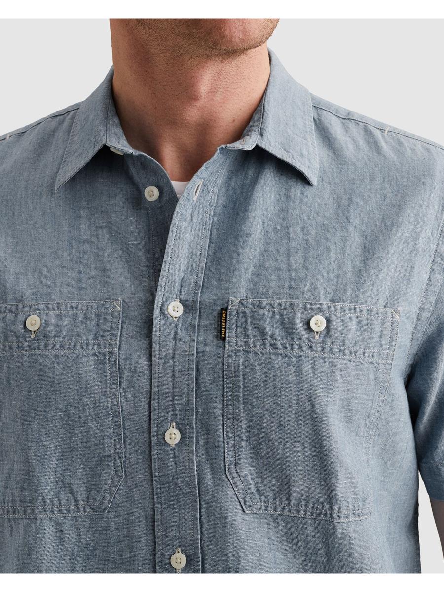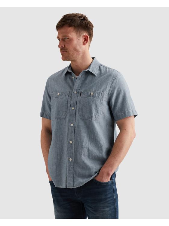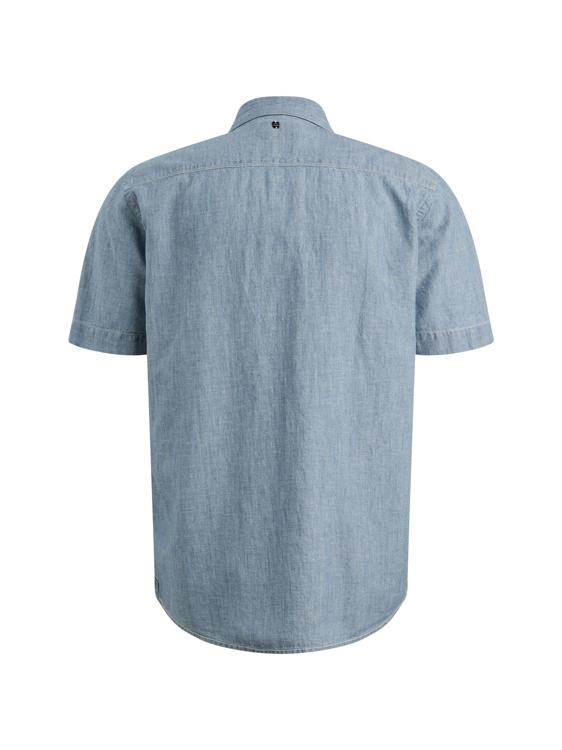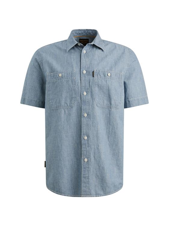 Dit heren overhemd in lichtblauwe chambray-look heeft korte mouwen, een klassieke kraag en een volledige knoopsluiting met lichtgekleurde knopen. Voorop zitten twee borstzakken met knoop; op de linkerzak een subtiel PME Legend label. Achter onder de kraag staat een klein wing-logo. De lichtgewicht, glad geweven stof draagt luchtig en blijft netjes. De afgeronde zoom geeft vrijheid, in of over je broek. Dit kledingstuk is te koop via de webshop of in de winkel bij Steegenga Mode in Friesland. Categorie: Heren, Overhemden.