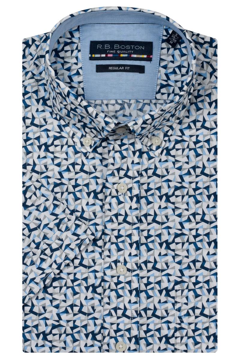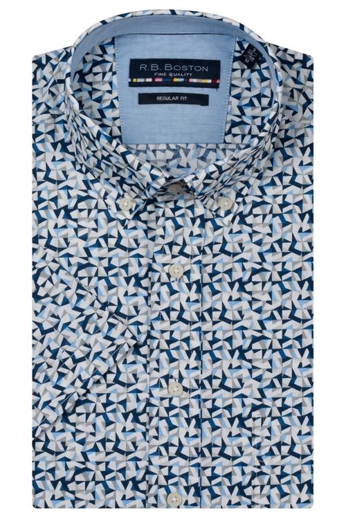Dit T‑Shirt van R.B. Boston is uitgevoerd in een zachte jerseykwaliteit die prettig ademt. Het model heeft een ronde hals zonder sluiting en korte mouwen. Het all‑over geometrische dessin in donkerblauw, grijs en off‑white springt direct in het oog. De comfortabele pasvorm zorgt dat je het kledingstuk solo draagt of gelaagd onder een overshirt. Een moderne keuze binnen Heren T‑Shirts & Polo's, beschikbaar zolang de voorraad strekt.