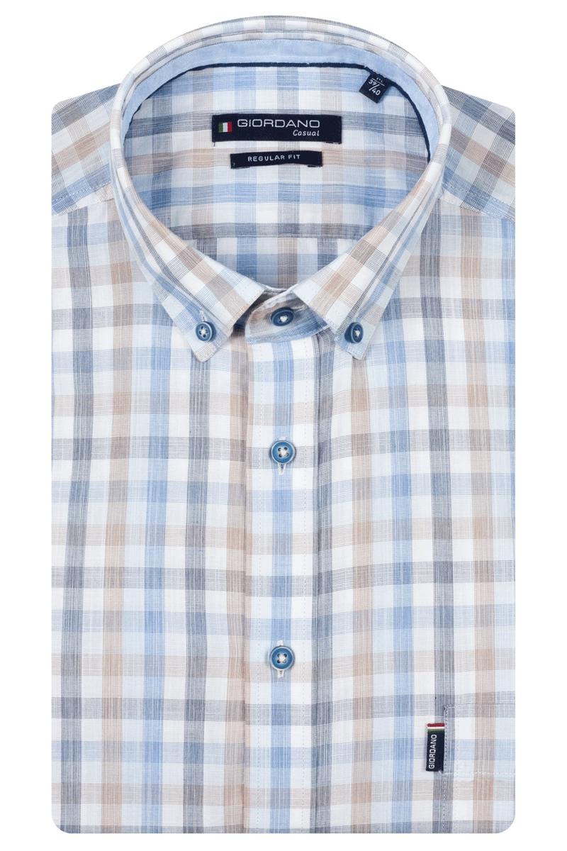 Giordano Overhemd 617340 is een heren overhemd in een zachte, ademende geweven kwaliteit. Het geruite dessin combineert lichtblauw, wit en zandtinten voor een frisse look. De button-down kraag blijft netjes zitten en de volledige knoopsluiting met blauwe knopen oogt strak. Het merklabel met het woord Giordano is subtiel zichtbaar aan de voorzijde. De comfortabele snit en nette afwerking bij kraagstand en knooplijst maken dit overhemd geschikt voor dagelijks gebruik.