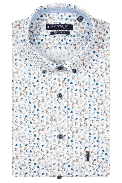 Dit Giordano overhemd is uitgevoerd in een glad geweven kwaliteit die comfortabel aanvoelt. De klassieke kraag met subtiele contrastvoering en de volledige knoopsluiting met donkere knopen geven het kledingstuk een verzorgde uitstraling. Het all‑over grafisch dessin in wit, blauw & beige oogt modern. Aan de voorzijde zit een subtiel Giordano-logo label; in de kraag staat het woord Giordano. De pasvorm is comfortabel en de afwerking is strak, passend binnen Heren, Overhemden.