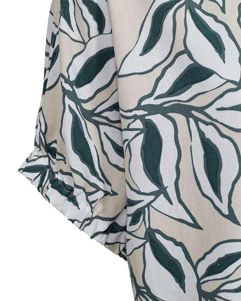 Deze dames tuniek van FREEQUENT valt soepel en licht, met een ronde hals en korte mouwen met vaste omslag. De achterzijde heeft een kleine keyhole met knoopsluiting. Het kledingstuk toont een all-over blad dessin in donkergroen en wit op een zandkleurige basis. De afgeronde zoom en relaxed fit geven bewegingsvrijheid en een flatterende look. Categorie: Dames, Blousen & Tunieken. Modelnaam: Freequent Tuniek 207911.