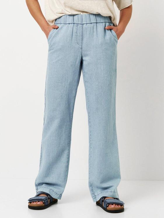 Deze TONI pantalon heeft een soepele denimlook in lichtblauw met een rechte pijp. De comfortabele, brede elastische tailleband zorgt voor een nette instap zonder zichtbare rits of knoop, terwijl de siergulp en twee steekzakken een clean silhouet geven. Het weefsel voelt licht en soepel aan, ideaal voor dagelijks dragen. Afgewerkt zonder opvallende logo’s of dessin zodat je de jeansachtige broek makkelijk combineert. Te koop via de webshop of in de winkel bij Steegenga Mode in Friesland.