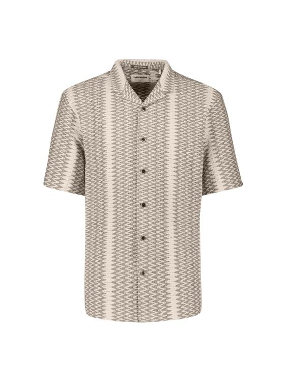 Dit Heren overhemd is gemaakt van een lichtgewicht, soepelvallende stof die prettig en luchtig aanvoelt. De open reverskraag geeft een ontspannen uitstraling, terwijl de doorlopende knoopsluiting met donkere knopen voor een nette finish zorgt. Het geometrische zigzagdessin in beige- en zandtinten valt direct op. Afgewerkt met korte mouwen en een rechte zoom, zonder borstzak voor een strakke look. Een stijlvolle keuze van No Excess.