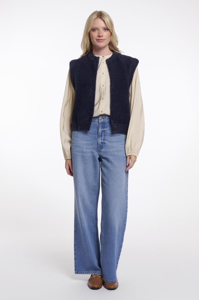 De teddylook sluit aan bij de gilet-trend en in donkerblauw oogt het tijdloos. Je combineert het moeiteloos met een blouse, jeans of een jurk voor werk of weekend. Draag het in het voor- en najaar of als laagje op frisse dagen. Een populaire keuze onder dames-wacht niet te lang.