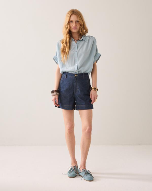 Deze lichtblauwe blouse is gemaakt van een soepelvallende, luchtige kwaliteit die elegant om het lichaam valt. De klassieke overhemdkraag en de doorlopende knoopsluiting voor zorgen voor een tijdloze uitstraling. Korte mouwen met vaste omslag en subtiel plooidetail geven een moderne touch. De afgeronde zoom valt iets langer achter voor een flatterend silhouet. Als dames blousen & tunieken ontwerp van Summum draag je dit kledingstuk moeiteloos van werk tot weekend.