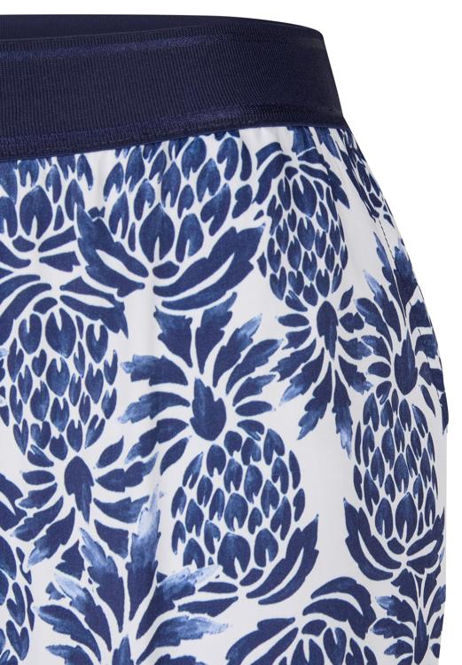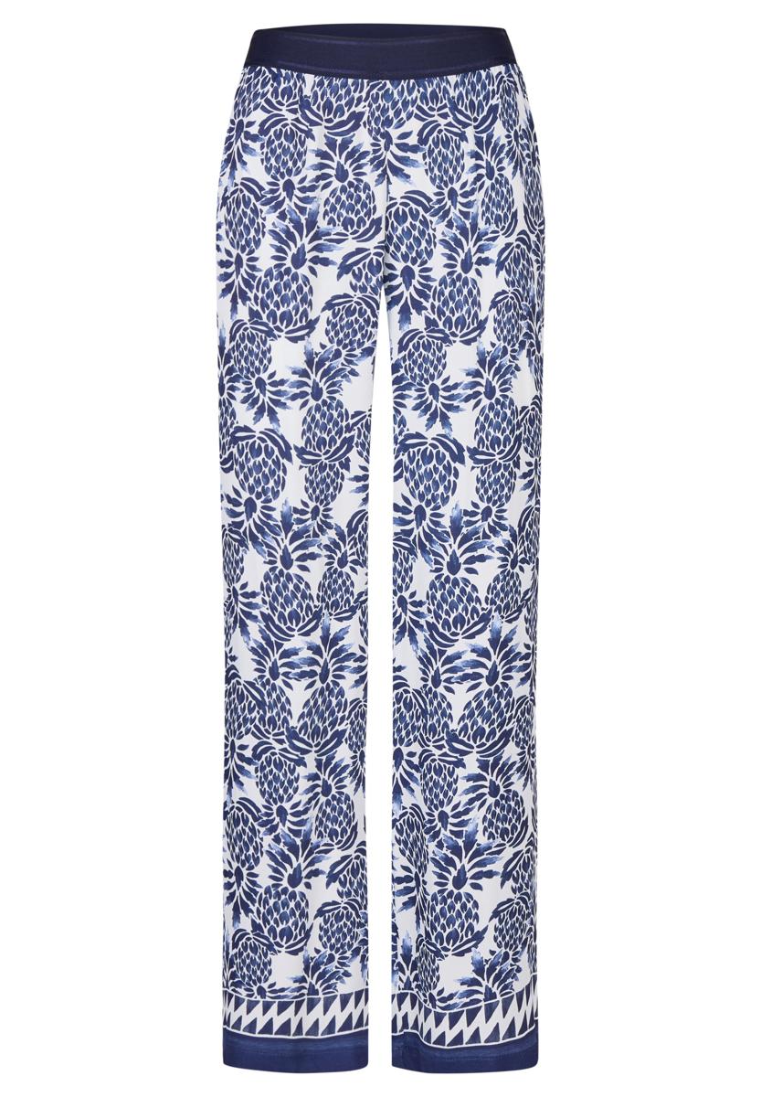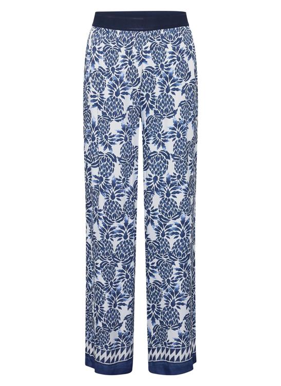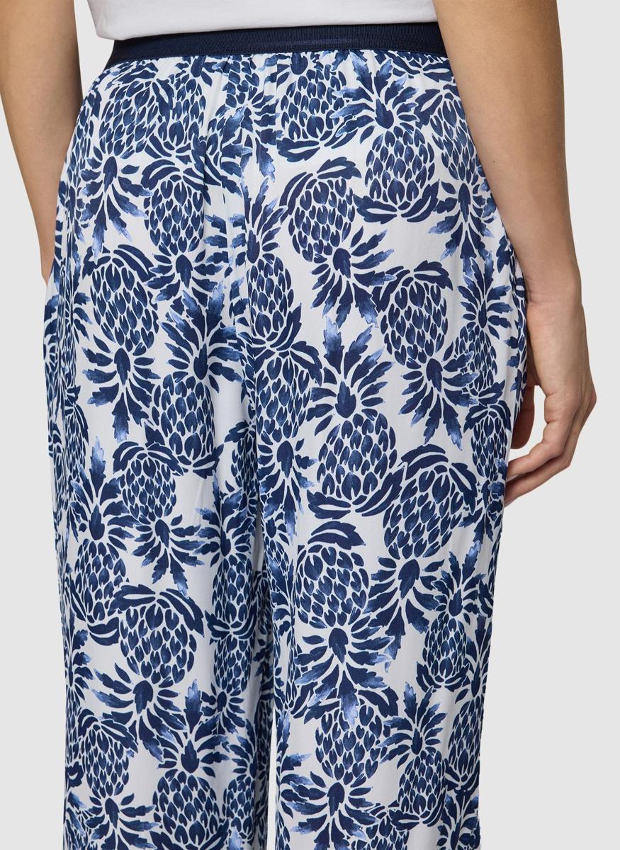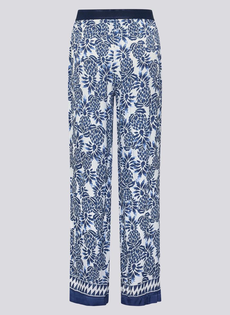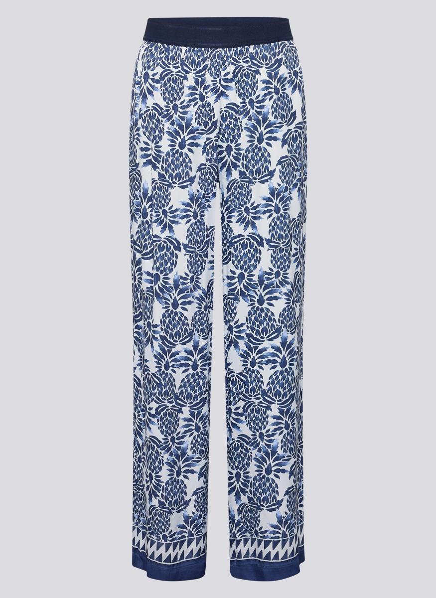 Het dessin past bij de blauwe & witte resorttrend en bij de botanische printtrend van dit seizoen. Combineer met een witte blouse, donkerblauwe top of fijngebreide trui; maak af met sandalen of loafers. Draag de broek casual overdag of feestelijk in de avond. Door de rustige kleurenmix laat dit kledingstuk zich goed stylen met neutrale tinten.
