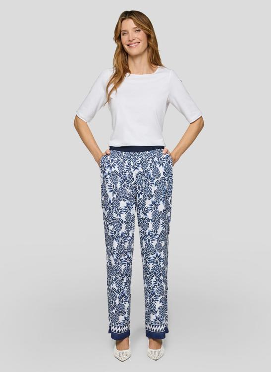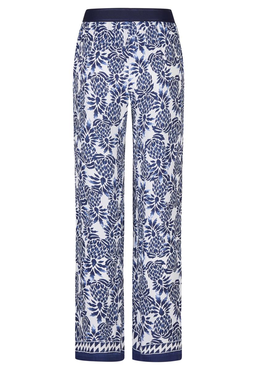 Deze Rabe dames broek heeft een soepel vallende kwaliteit en een comfortabele, contrasterende elastische tailleband zonder sluiting. De rechte, wijde pijpen zorgen voor elegante beweging. Het blauw-witte botanische dessin met sierlijke border langs de zoom geeft een frisse uitstraling. Praktische steekzakken maken het ontwerp compleet. Dankzij het pull-on model trek je de broek eenvoudig aan en zit hij de hele dag prettig. Een tijdloze keuze van Rabe voor vele gelegenheden.