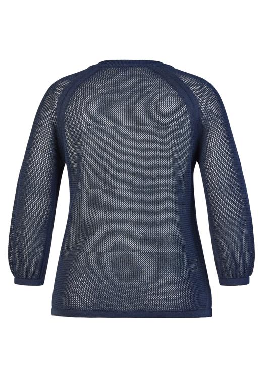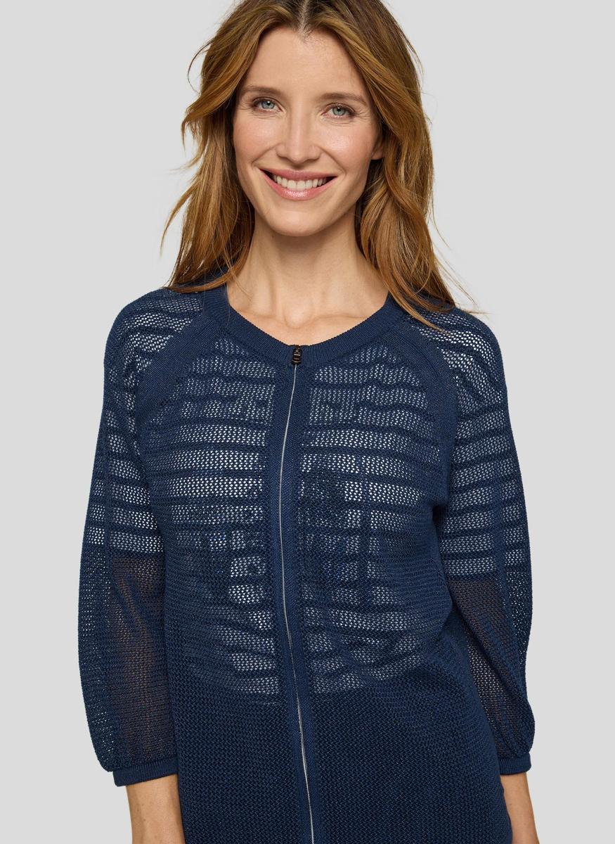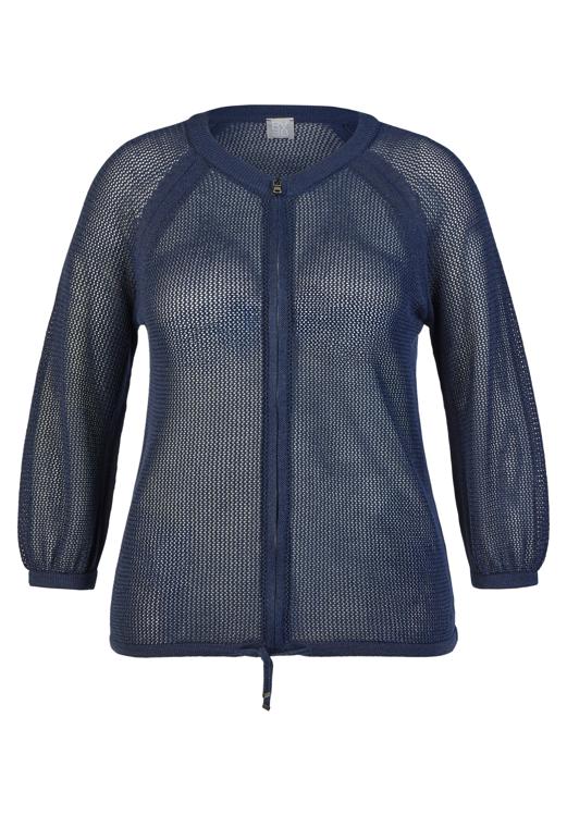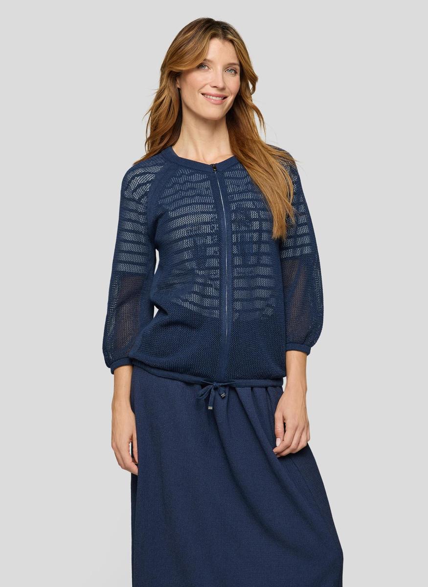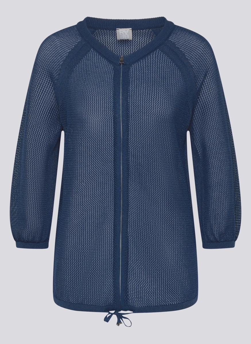 Dit lichtgewicht kledingstuk van Rabe heeft een opengewerkte breistructuur in donkerblauw. De V-hals en doorlopende ritssluiting geven een moderne, verzorgde look. Raglan 3/4-mouwen met subtiele elastische boorden bieden comfortabele bewegingsvrijheid. De zoom heeft een verstelbaar koord, zodat je de pasvorm naar wens kunt aantrekken. Als onderdeel van Dames, Truien & Vesten is dit ademende vest een veelzijdige laag voor het hele jaar.
