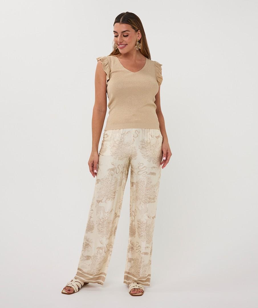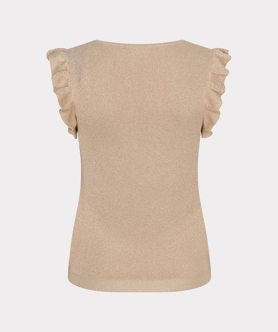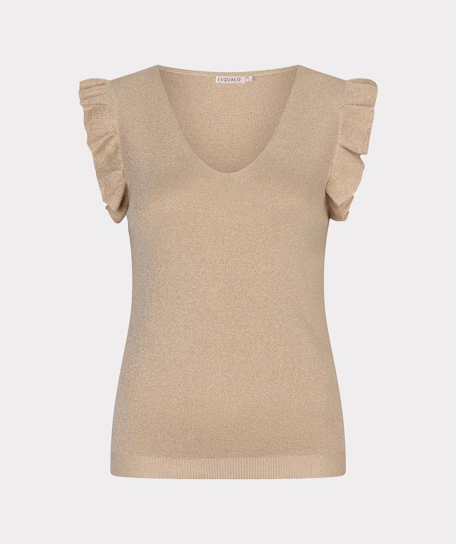 Deze Dames top van Esqualo is uitgevoerd in een zachte, fijngebreide kwaliteit met een elegante V-hals. De schouder heeft speelse ruches die een subtiel vleugelmouw-effect geven. Het effen beige dessin maakt combineren easy, terwijl de ribboord aan de zoom zorgt voor een mooie aansluiting. Zonder sluiting en zonder zakken: je trekt het kledingstuk moeiteloos aan. Een veelzijdige T‑Shirt & Top keuze met een tijdloze uitstraling.