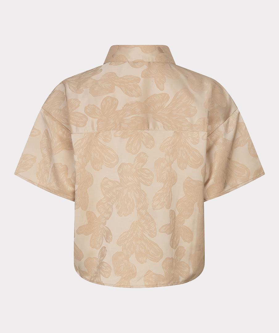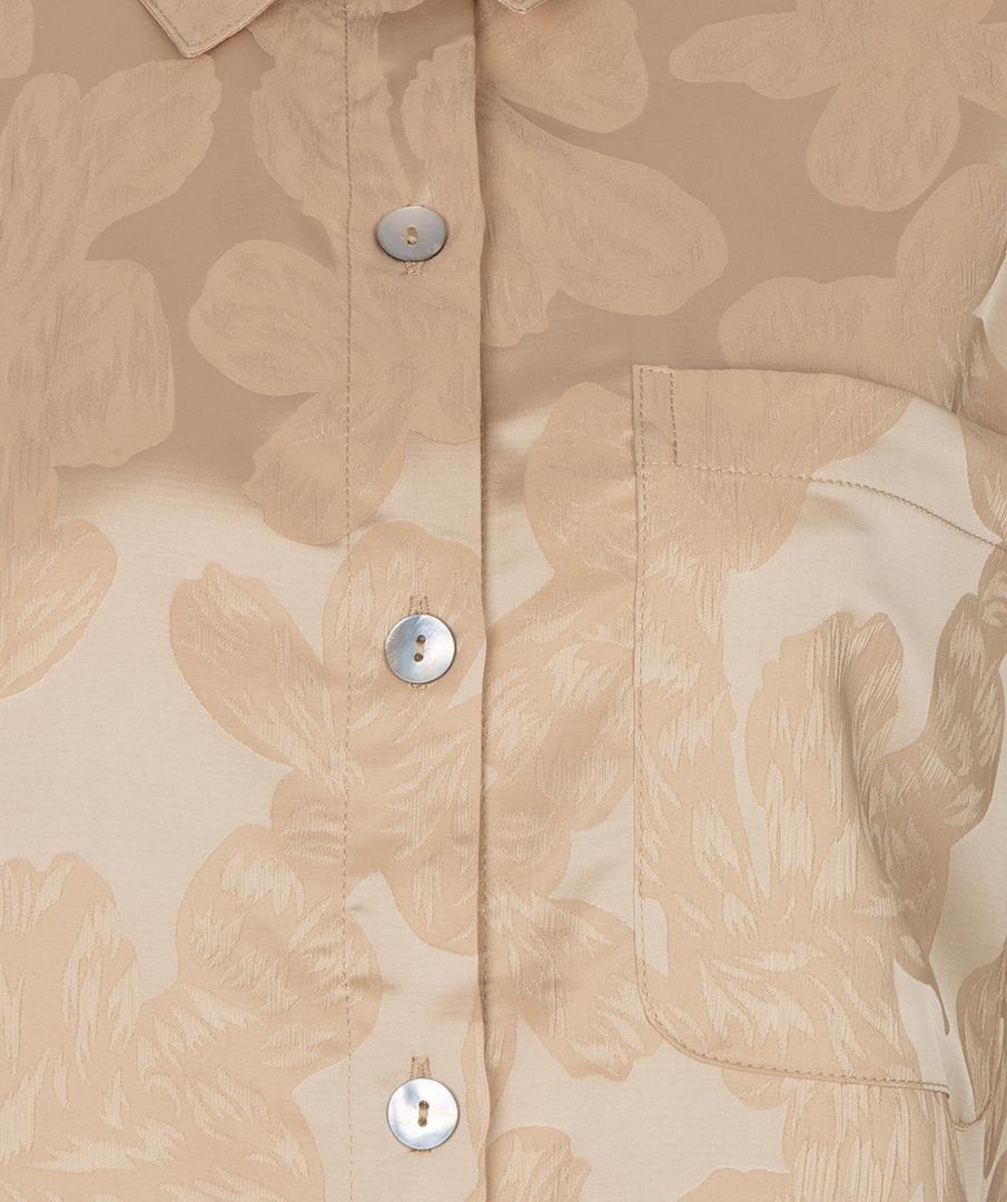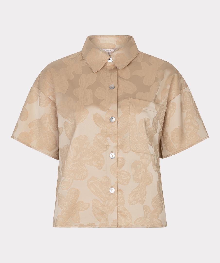 De Esqualo Top HS26.15217 heeft korte mouwen, een klassieke overhemdkraag en een doorlopende knoopsluiting met glanzende knopen. Voorzien van een nette borstzak en een ton-sur-ton bloemendessin in beige tinten voor een rustige, luxe look. De rechte zoom houdt het geheel verzorgd. Een stijlvol kledingstuk van Esqualo binnen Dames, T-Shirts & Tops dat moeiteloos netjes én casual kan.