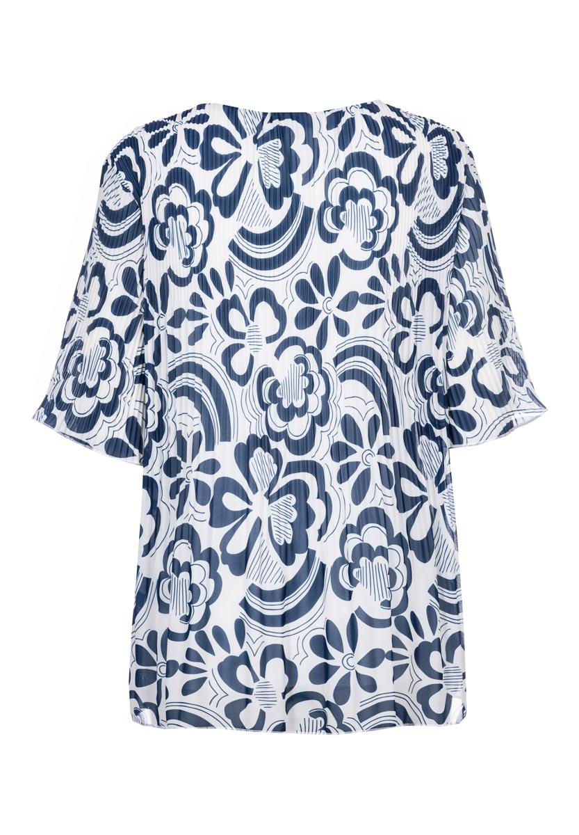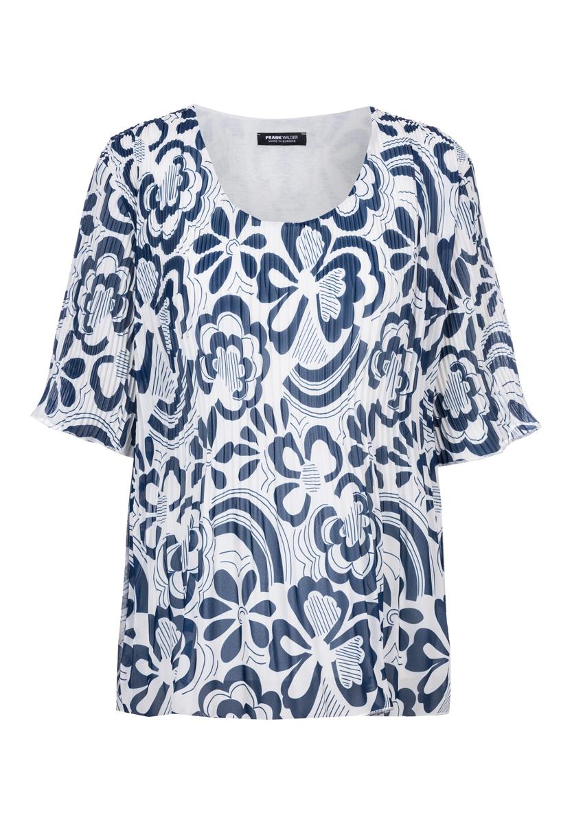 Deze blouse voor dames van Frank Walder is uitgevoerd in een zachte, lichtvallende stof met een ronde hals. Het instapmodel heeft halflange, licht uitlopende mouwen en een all-over bloemen dessin in diepblauw op wit, aangevuld met grafische bogen. Zonder knopen, rits of zakken voor een gladde look; met merklabel ‘Frank Walder’ in de hals. De comfortabele pasvorm maakt dit kledingstuk ideaal voor dagelijks dragen en netjes combineren.