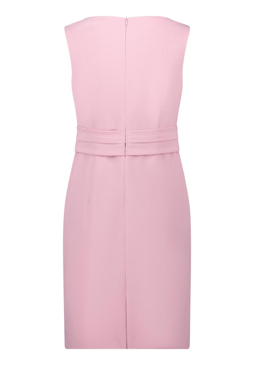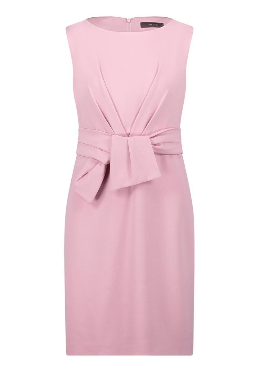 Deze damesjurk van Vera Mont valt glad en elegant, uitgevoerd in een effen, zachte roze tint. De ronde hals is kraagloos; voorzijde met geplooide details en een verfijnde strik op de taille die flatteert. De achterzijde heeft een blinde ritssluiting en een nette, doorlopende naad; zonder zakken en zonder opvallende logo’s. De pasvorm is recht en verzorgd, ideaal voor gelegenheden. Onder Categorie Dames, Jurken & rokken valt dit kledingstuk op door zijn verzorgde afwerking.