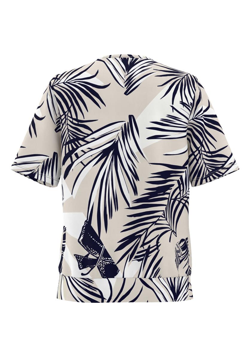 Deze damesblouse van Frank Walder is gemaakt van een zachte, soepelvallende kwaliteit die mooi meebeweegt. De ronde hals heeft een kleine V‑split met een subtiele plooi middenvoor. De korte mouwen en het rechtvallende model zorgen voor draaggemak. Het dessin is een all‑over botanische bladprint in donkerblauw op een lichte basis. De blouse heeft geen zichtbare sluiting en geen zakken, voor een rustig beeld. Een veelzijdig kledingstuk binnen Dames, Blousen & Tunieken.