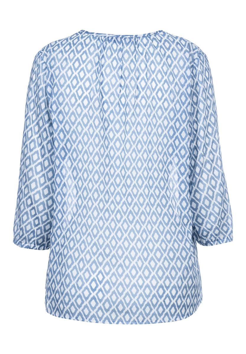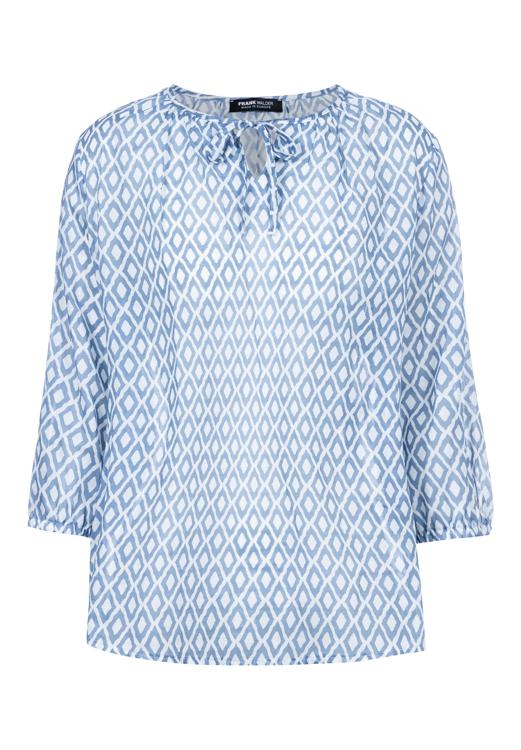 Deze Frank Walder blouse valt soepel en voelt licht aan. Het ontwerp heeft een ronde hals met strikkoord en een klein splitje. De 3/4 mouw geeft lucht en bedekt elegant. De all-over geometrische ruit in lichtblauw en wit zorgt voor een frisse uitstraling. De pasvorm is recht, zonder zakken, zonder knopen of rits; je sluit de hals met het koord. Subtiele plooien bij de hals voegen beweging toe. Een veelzijdige keuze binnen Dames, Blousen & Tunieken van het merk Frank Walder.