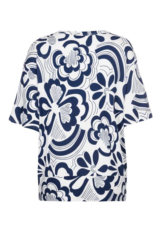 Dit T-Shirt van Frank Walder is gemaakt in een soepele jerseykwaliteit die prettig aanvoelt. De ronde hals en korte mouw geven een elegante uitstraling, terwijl je het dankzij de pullover-vorm zonder sluiting makkelijk aantrekt. Het all-over dessin toont grote donkerblauwe bloemen met grafische lijnen op een witte basis voor een frisse look. De rechtvallende pasvorm zorgt voor bewegingsvrijheid en een mooi silhouet, perfect voor elke dag.