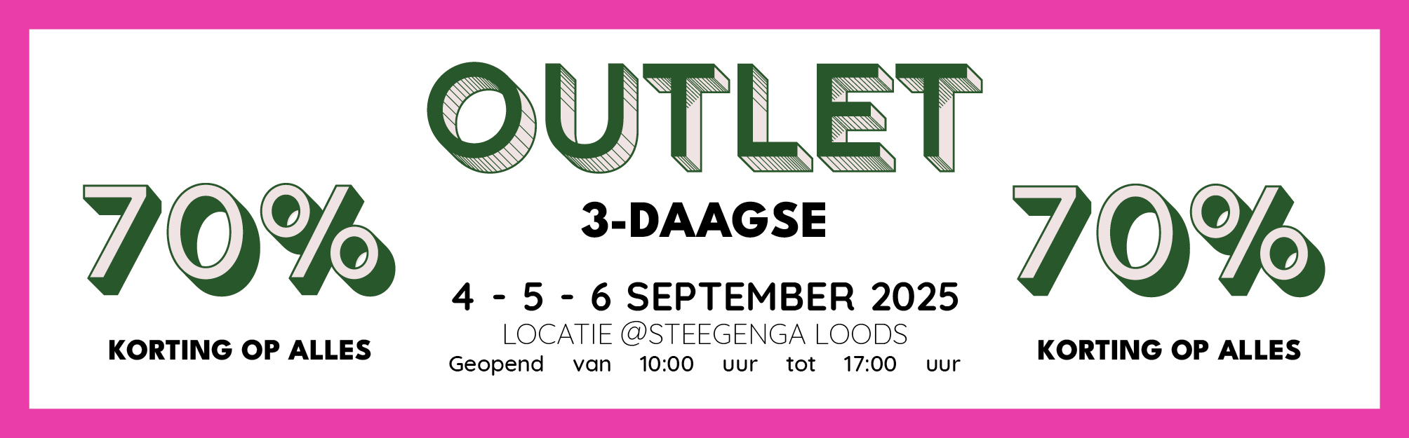 Onze loods in Balk hebben wij weer omgebouwd tot Outlet en wij doen weer drie dagen de deuren open. Donderdag 4, vrijdag 5 en zaterdag 6 september 2025 is onze Outlet geopend van 10:00 uur tot 17:00 uur. Je shopt tijdens deze editie alles met 70% korting!